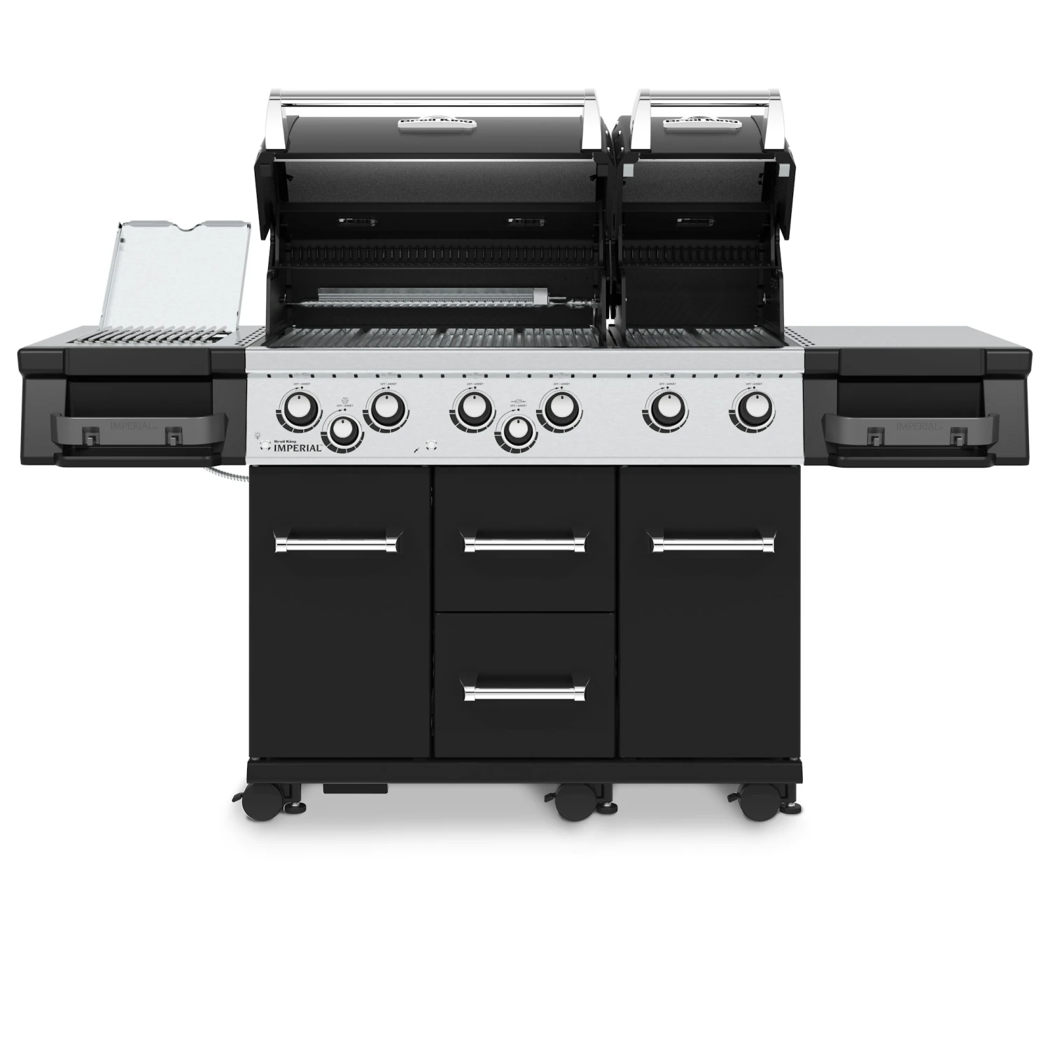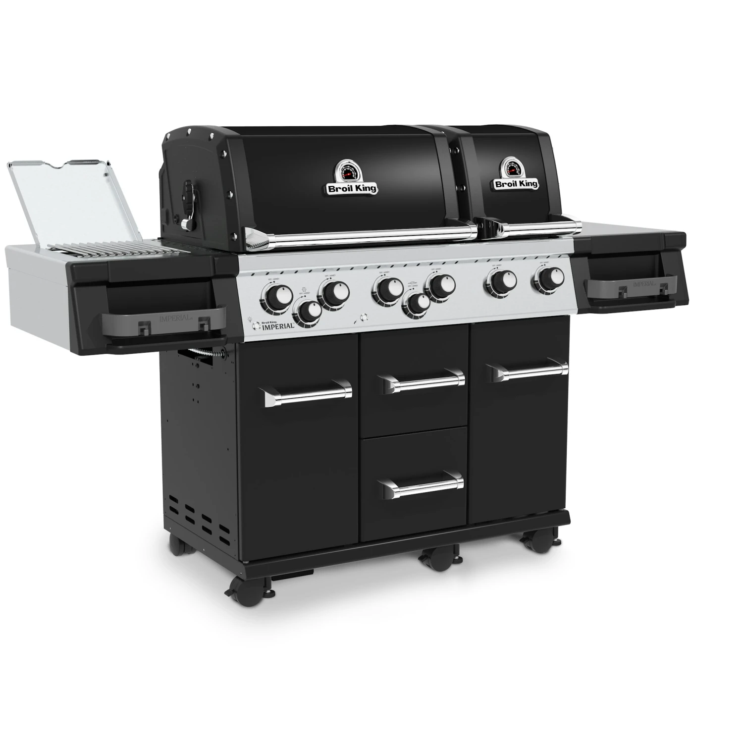 Der Broil King Imperial 690 IR verfügt über zwei völlig unabhängige Grillkammern. Insgesamt über 6 Edelstahl Dual-Tube Brenner, einer Grillflächenbeleuchtung, neuartige Edelstahlgussgrillroste, Flav-R-Wave Verdampfersystem, sowie Kontrollknopfbeleuchtung und einer elektrischen Zündung aller Brenner. Der Imperial 690 IR verfügt über Edelstahl Seitenablagen rechts, einem geschlossenem, schwarz lackiertem Unterwagen.