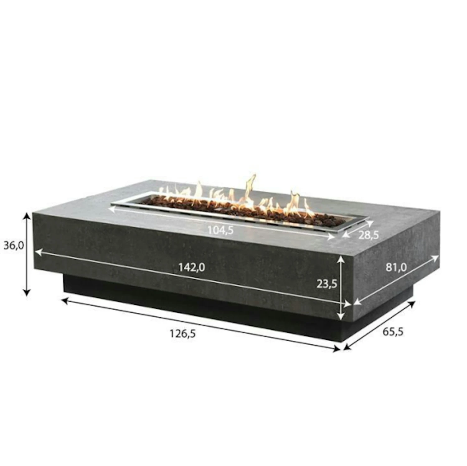 Gardenforma Gas Feuerstelle Hampton aus Faserbeton in Betonoptik, grau. Dekorative Gas-Feuerstelle aus hochwertigem Faserbeton Werkstoff in Premium-Betonoptik. Mit dieser Feuerstelle setzen Sie ein Highlight in jedem Garten und auf jeder Terrasse. Zum Zubehör gehören unter anderem rötliche Lavasteine, eine Edelstahl-Brennerschale sowie ein Schutz der Zündvorrichtung. Maße: L 142 x B 81 x H 36 cm