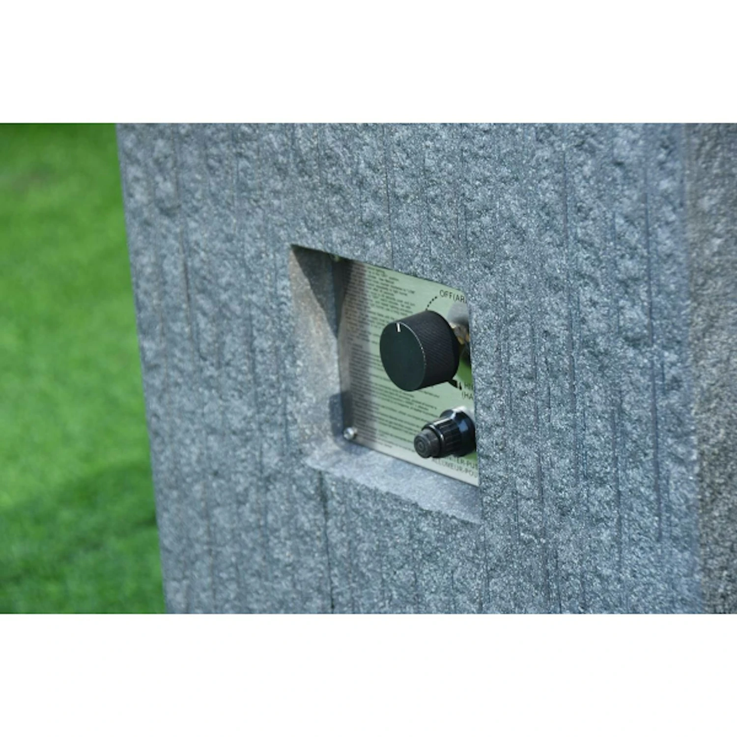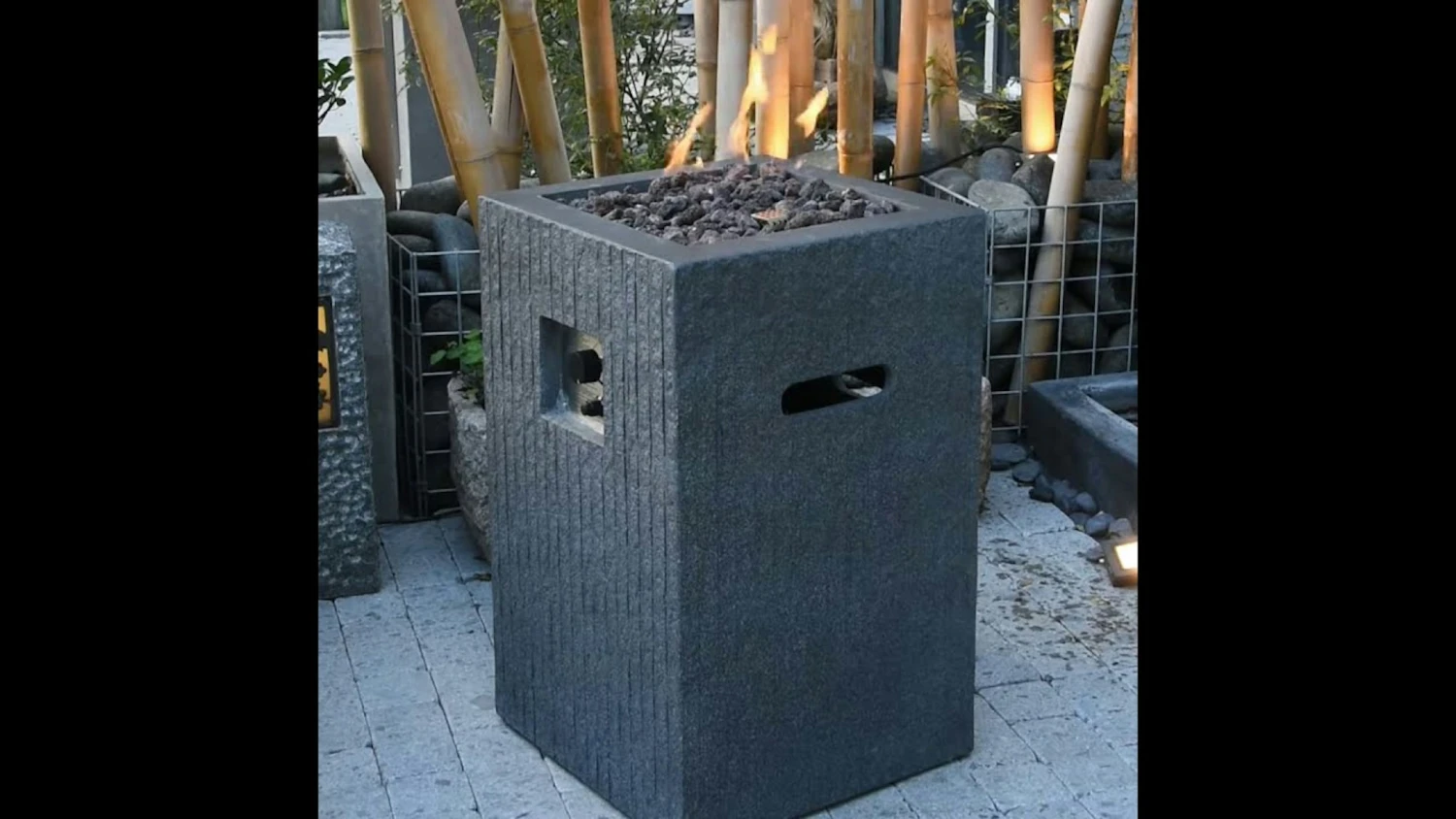 Gardenforma Gas Feuerstelle Mayon. Basalt-Optik, Faserbeton, inkl. Druckminderer, Anschlussleitung und Lavasteine schwarz, für innenliegenden Gasbehälter. Maße: L 45 x B 45 x H 70 cm