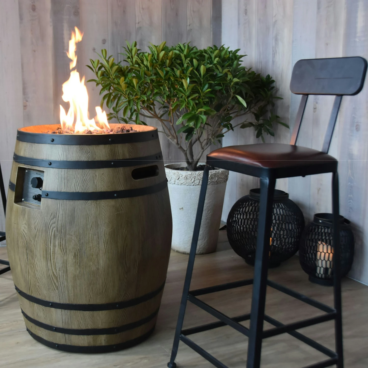 Gasfeuerstelle Porvoo aus Faserbeton in einer Holzfass-Optik, inkl. Anschlussleitung mit Druckminderer und rötliche Lavasteine. Dekorative Gas-Feuerstelle aus hochwertigem Faserbeton Material. Gestaltet in einer edlen Holzfass-Optik. Mit dieser Gas Feuerstelle setzen Sie ein Highlight in jedem Garten und auf jeder Terrasse. Zum Zubehör gehören bräunliche Lavasteine, eine Edelstahl-Brennerschale sowie ein Edelstahl-Schutz der Zündvorrichtung. Die Feuerstelle verfügt über einen seitlich angebrachten elektronischen Starter und einen Gas-Regulierer, über den die Höhe der Flammen einstellbar ist. Maße: ø 68 x H 82 cm