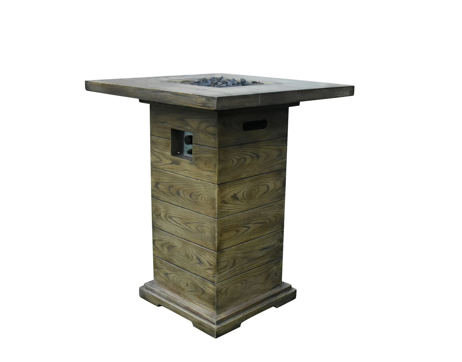 Gasfeuerstelle Rova Bar aus Faserbeton in einer Holz-Optik, inkl. Anschlussleitung mit Druckminderer und rötliche Lavasteine. Dekorative Gas-Feuerstelle aus hochwertigem Faserbeton Material. Gestaltet in einer Holzoptik mit Bar-Tisch Funktion. Mit dieser Gas Feuerstelle setzen Sie ein Highlight in jedem Garten und auf jeder Terrasse. Zum Zubehör gehören bräunliche Lavasteine, eine Edelstahl-Brennerschale sowie ein Edelstahl-Schutz der Zündvorrichtung. Die Feuerstelle verfügt über einen seitlich angebrachten elektronischen Starter und einen Gas-Regulierer, über den die Höhe der Flammen einstellbar ist. Bei der auf den Abb. zu sehenden Glasumrandung handelt es sich um optionales Zubehör. Maße: L 87 x B 87 x H 106 cm