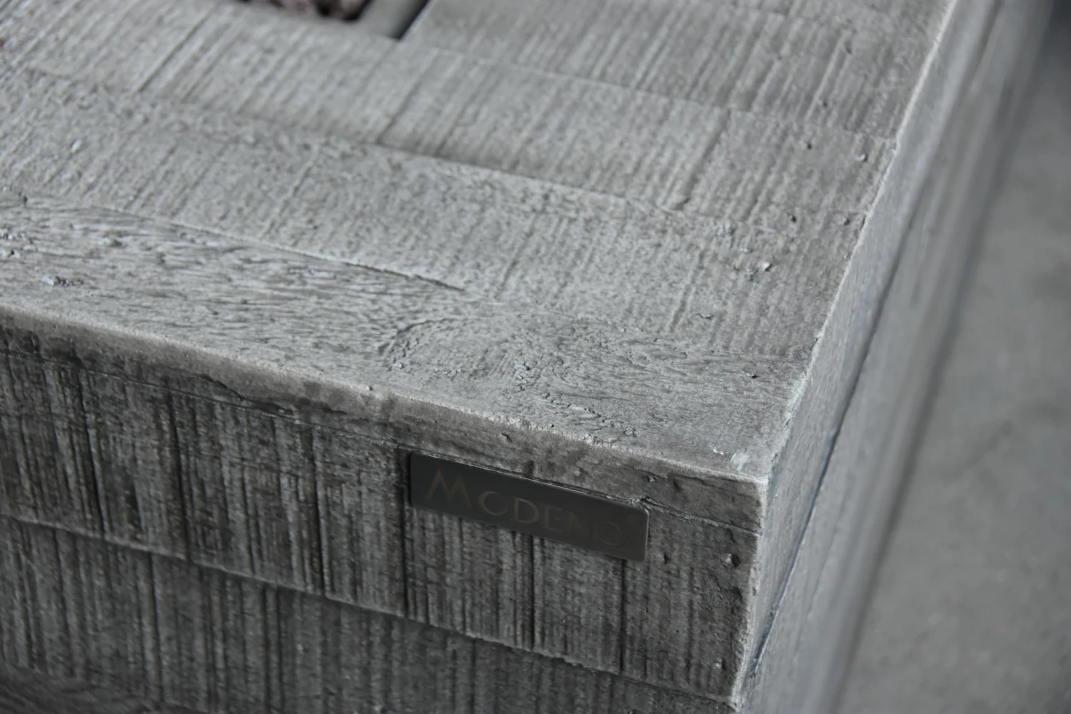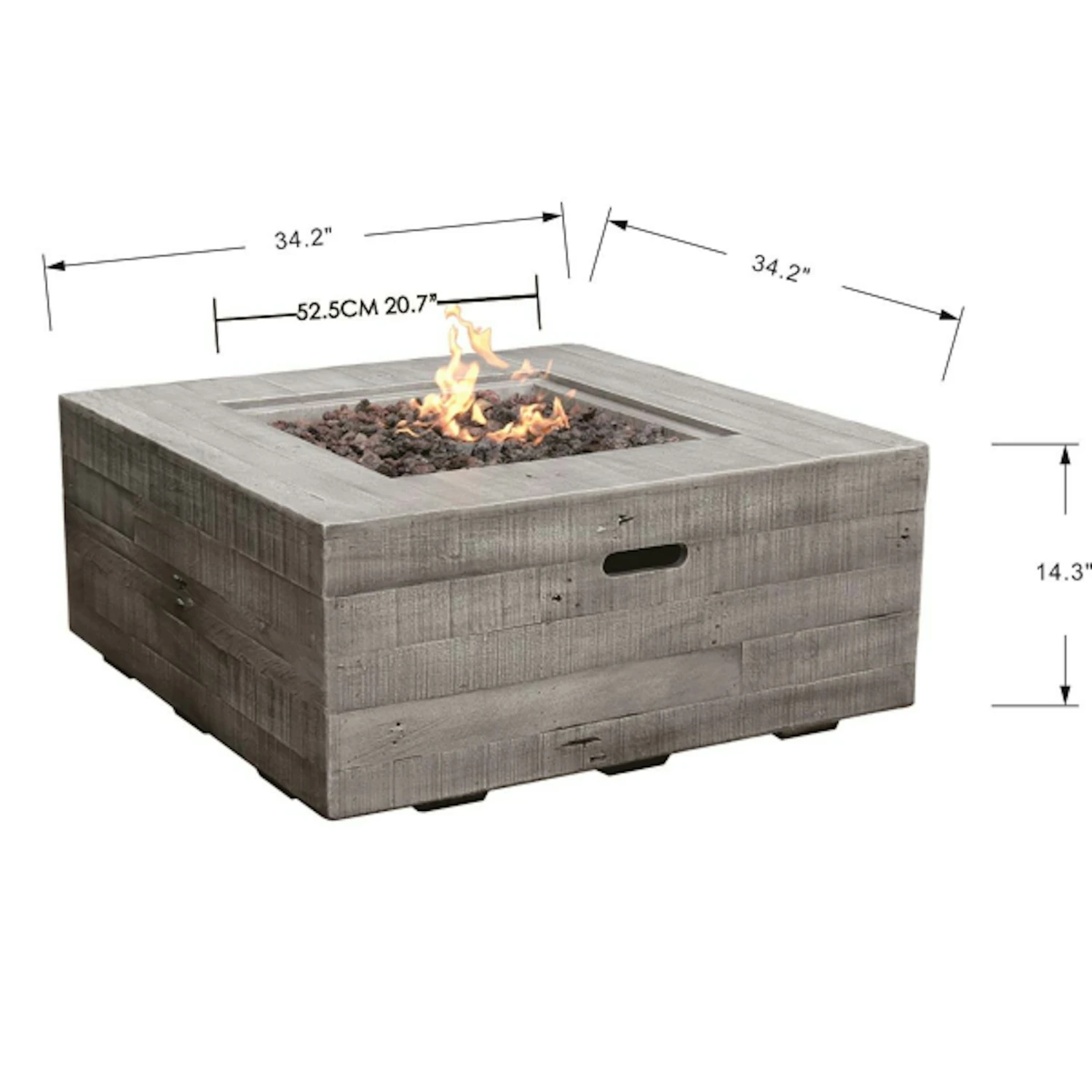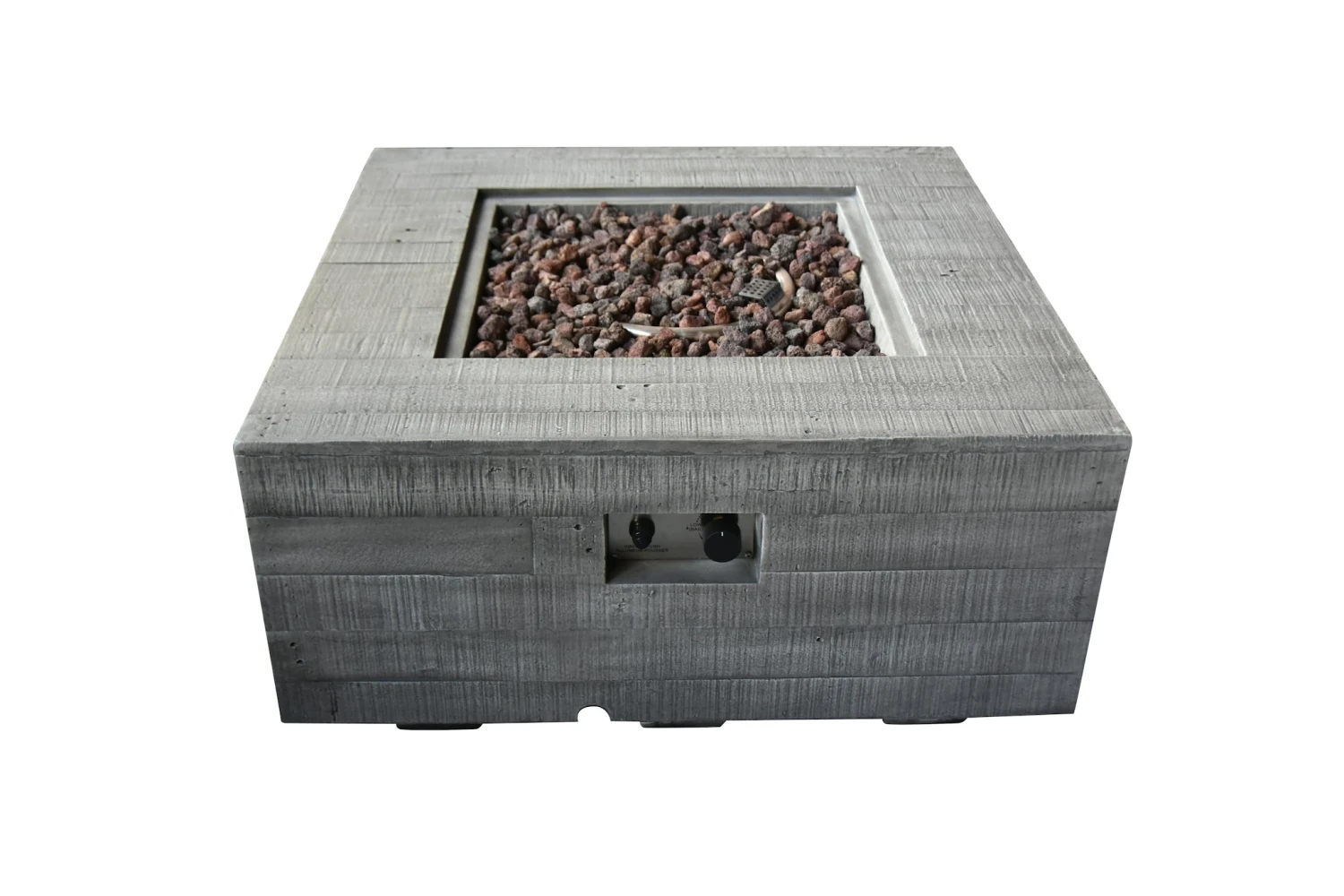 Gasfeuerstelle Wilton aus Faserbeton in grauer Holz-Optik, inkl. Anschlussleitung mit Druckminderer und rötliche Lavasteine. Dekorative Gas-Feuerstelle aus hochwertigem Faserbeton Material. Das Design ist in einer Holzoptik gestaltet. Mit dieser Gas Feuerstelle setzen Sie ein Highlight in jedem Garten und auf jeder Terrasse. Zum Zubehör gehören bräunliche Lavasteine, eine Edelstahl-Brennerschale sowie ein Edelstahl-Schutz der Zündvorrichtung. Die Feuerstelle verfügt über einen seitlich angebrachten elektronischen Starter und einen Gas-Regulierer, über den die Höhe der Flammen einstellbar ist. Maße: L 87 x B 87 x H 38 cm