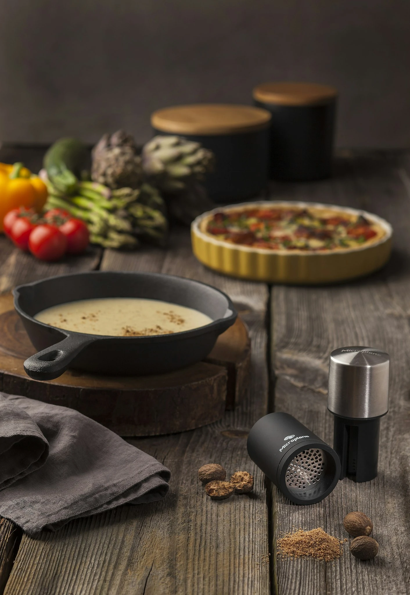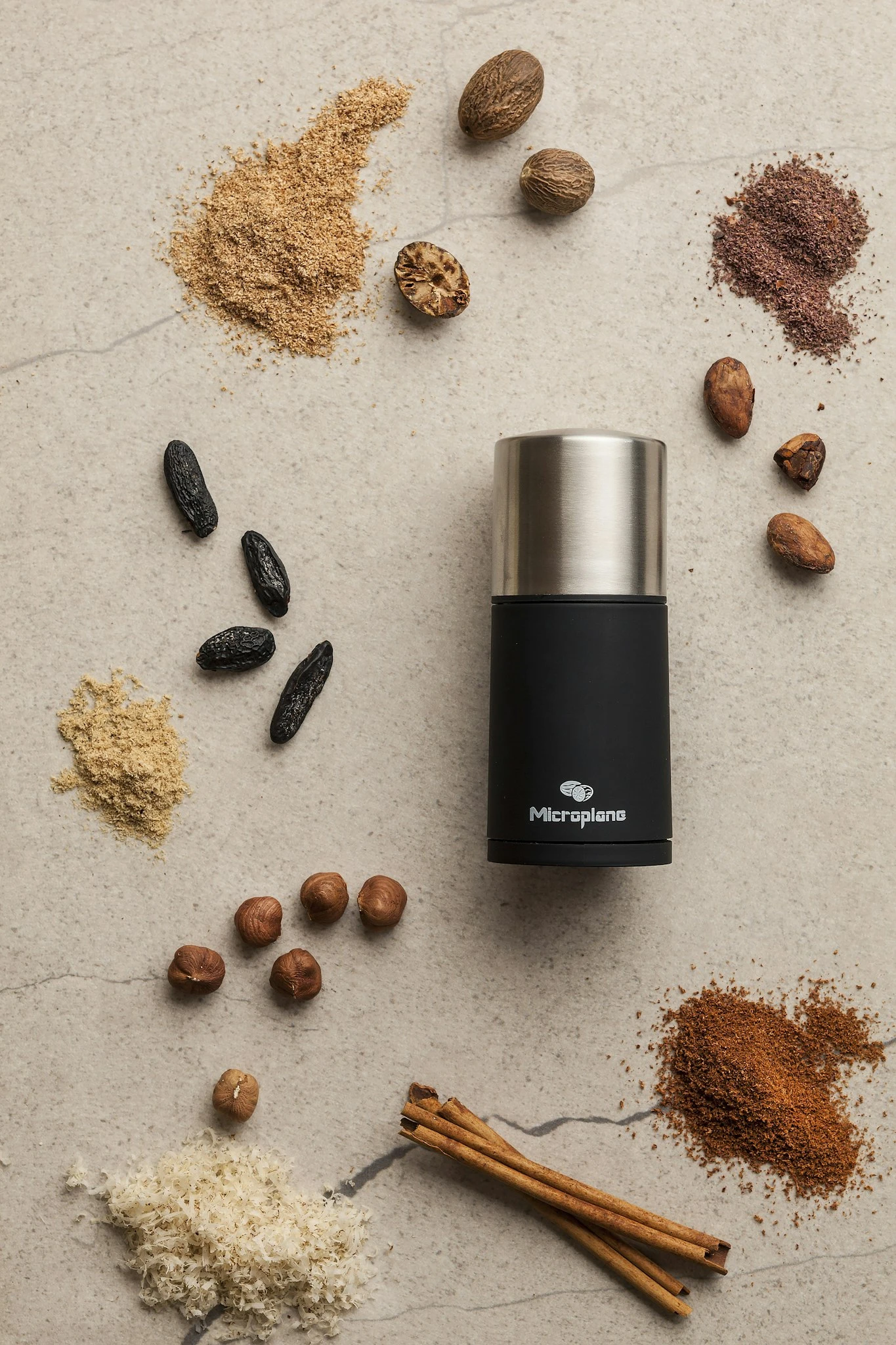 Die Muskatmühle 2 in 1 von Microplane ist das neue Must-have für Gewürze. Reiben Sie mit der feinen, photo-geätzten Edelstahlklinge -Made in USA -harte Gewürze wie Muskatnuss, Zimt, Tonkabohnen oder Nüsse mühelos und präzise. Nehmen Sie den Deckel ab, füllen Sie das Gewürz ein. Durch festes Drehen des Deckels im Uhrzeigersinn erhalten sie frische, aromatische, fein geriebene Gewürze im Handumdrehen. In dem Behälter im Deckel können Sie Gewürze aromafrisch aufbewahren und ein praktischer Silikonverschluß vermeidet Gewürzstaub. Erschaffen Sie eine wahre Geschmacksexplosion in Speisen und Getränken. Maße der Mühle: 21,1 cm x 16,2 cm x 16,0 cm