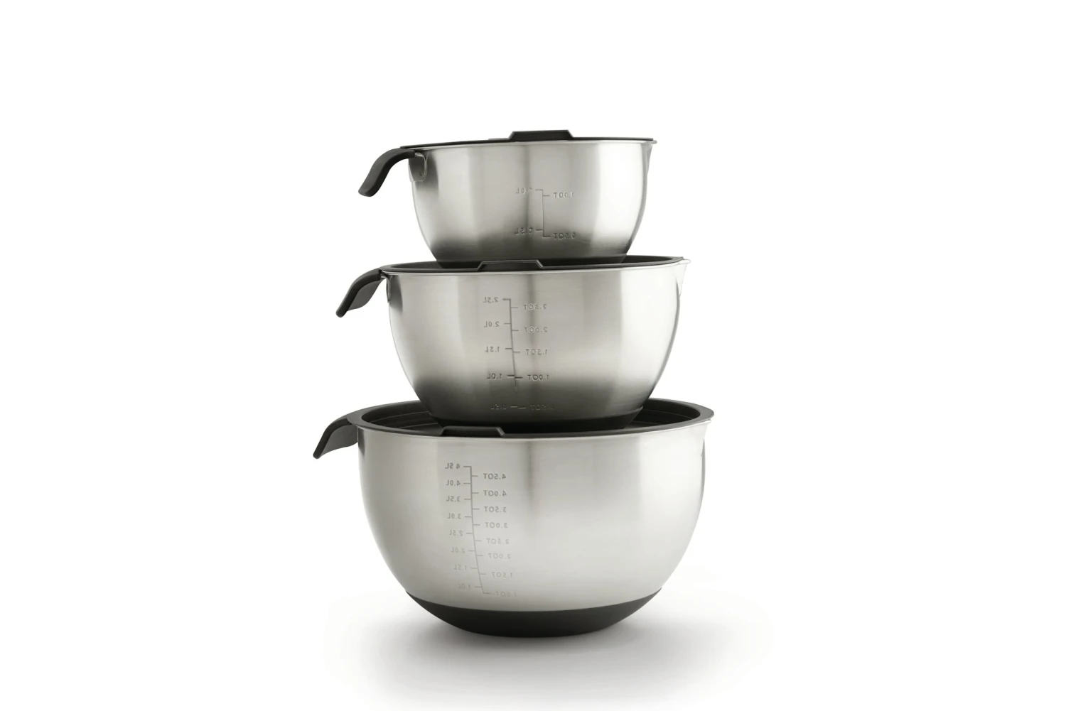 Das Napoleon Edelstahlschalen-Set besteht aus Schüsseln mit drei verschiedenen Größen. Metrische und imperiale Maßeinheiten innen. Durch luftdichte Deckel bleiben Lebensmittel, auch im Kühlschrank oder in der Speisekammer, frisch . Ein Silikonunterteil verhindert verrutschen.