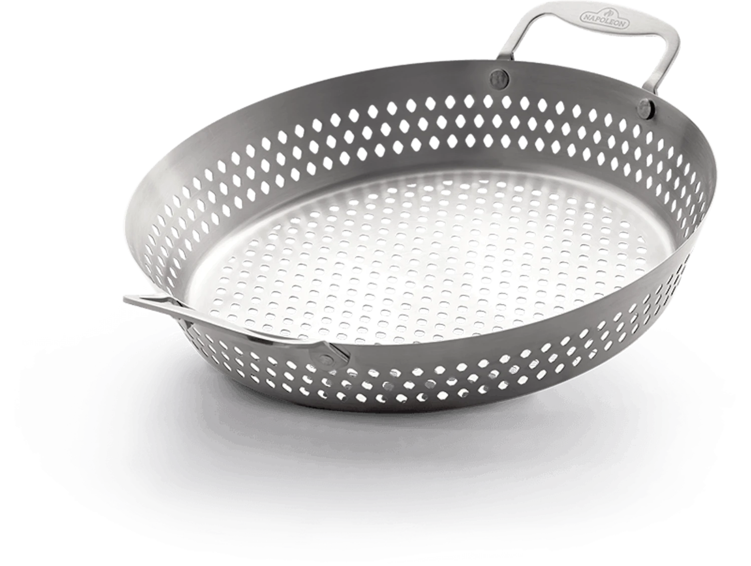Die Wok-Grillplatte aus Edelstahl von Napoleon eignet sich ideal zum Grillen kleinerer Teile. Das perforierte Design und der Edelstahl leiten die Wärme ideal für das nötige Grillaroma. Schleudern, schwenken und verschieben Sie den Wok dank der integrierten Griffe – wir empfehlen den Gebrauch von Grillzangen oder hitzebeständigen Handschuhen. Durch das breite und tiefe Design eignet sich der Wok zum Kochen für mehrere Leute oder Gruppen, zudem ist er spülmaschinenfest.