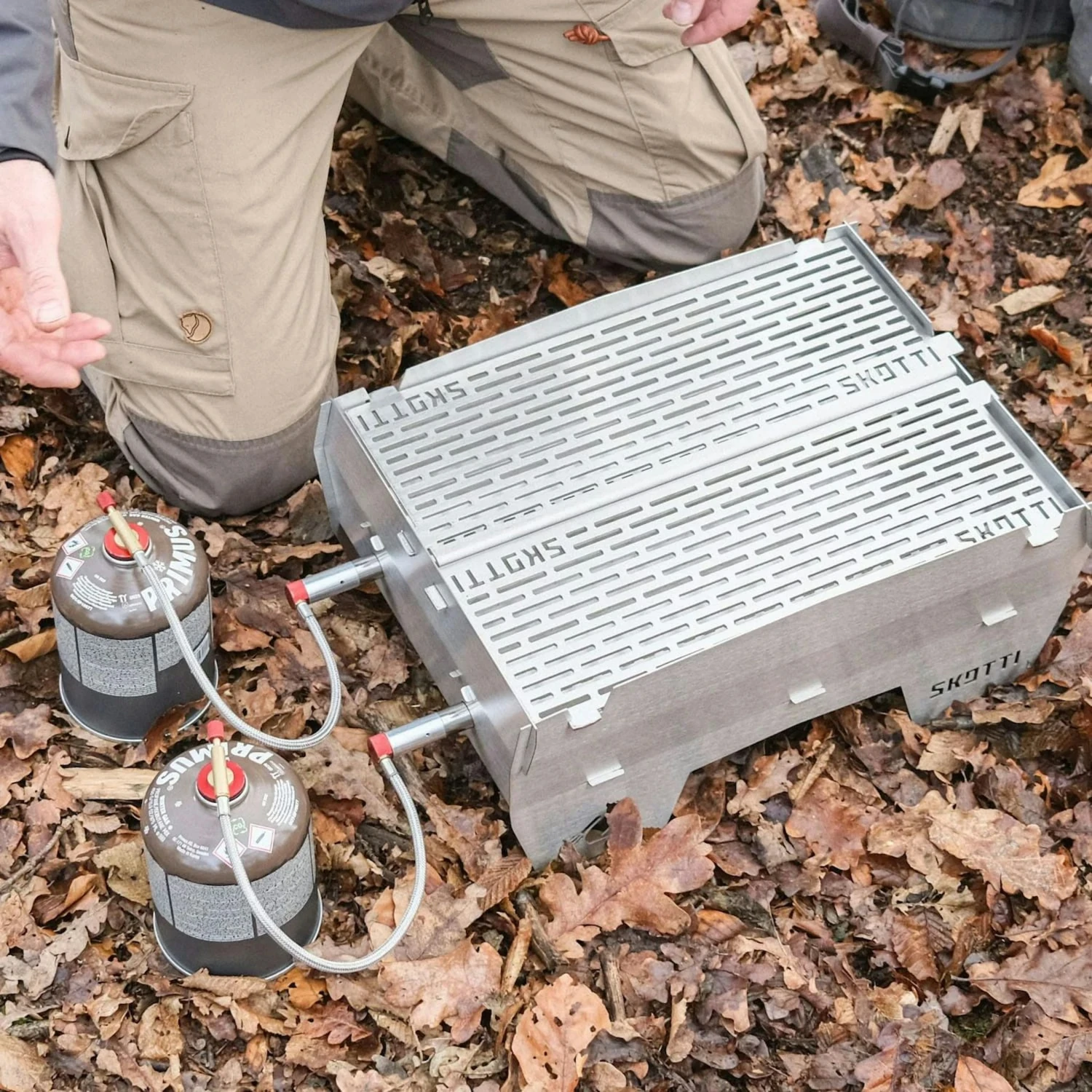 SKOTTI MAX – So praktisch wie das Original, nur Größer Mit dem Skotti Max schlägst Du nahezu alle Fliegen mit einer Klappe. So praktisch und schnell einsatzbereit wie der kleine orginale Skotti, nur fast doppelt so groß. Mit zwei Brennern, zwei Gasflaschenadaptern und einer Grillfläche von 39,5 x 30 cm ist der Skotti Max quasi Skotti x 2 – bei einem nach wie vor unglaublich kleinen Packmaß.