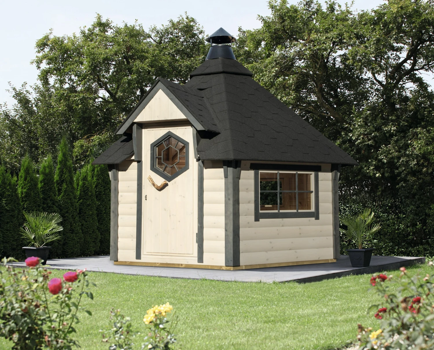 Machen Sie es, wie die Skandinavier und laden Sie Freunde zum Grillen ein, wann immer Ihnen danach ist – ganz unabhängig vom Wetter. Diese gemütliche Wolff Finnhaus Grillkota 6.7 ist in der Größe von 7 m² für ca. 10 Personen geeignet. Inkl. Grillanlage, Dachschindeln, Grilltischen, Sitzbänken, drei Fenstern (isolierverglast), Leimholzür mit Zylinderschloss und Holzgriff. Ausführung: naturbelassen Schindelfarbe: schwarz Sockelmaß: 320 x 277 cm Gesamtmaß: 370 x 327 cm