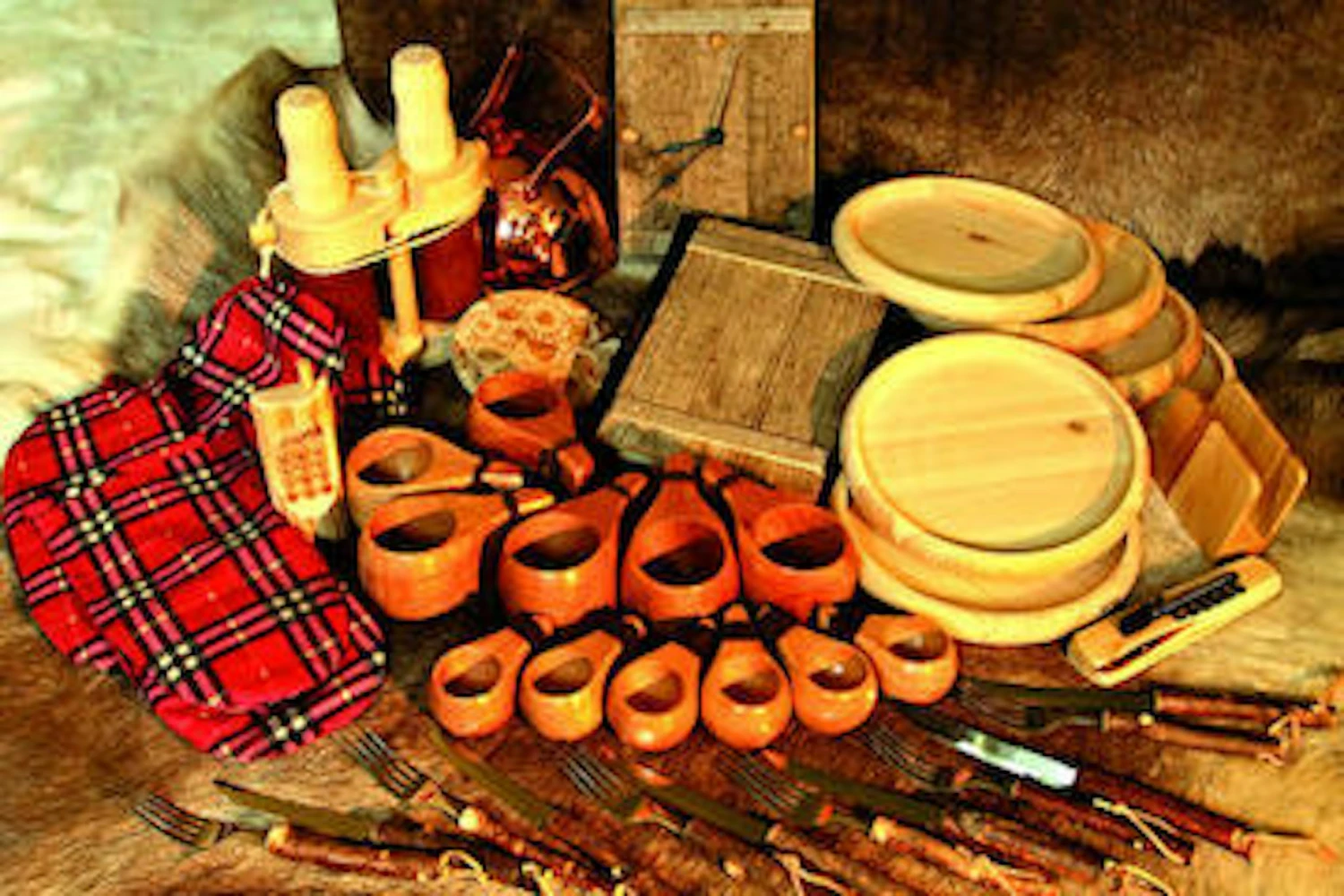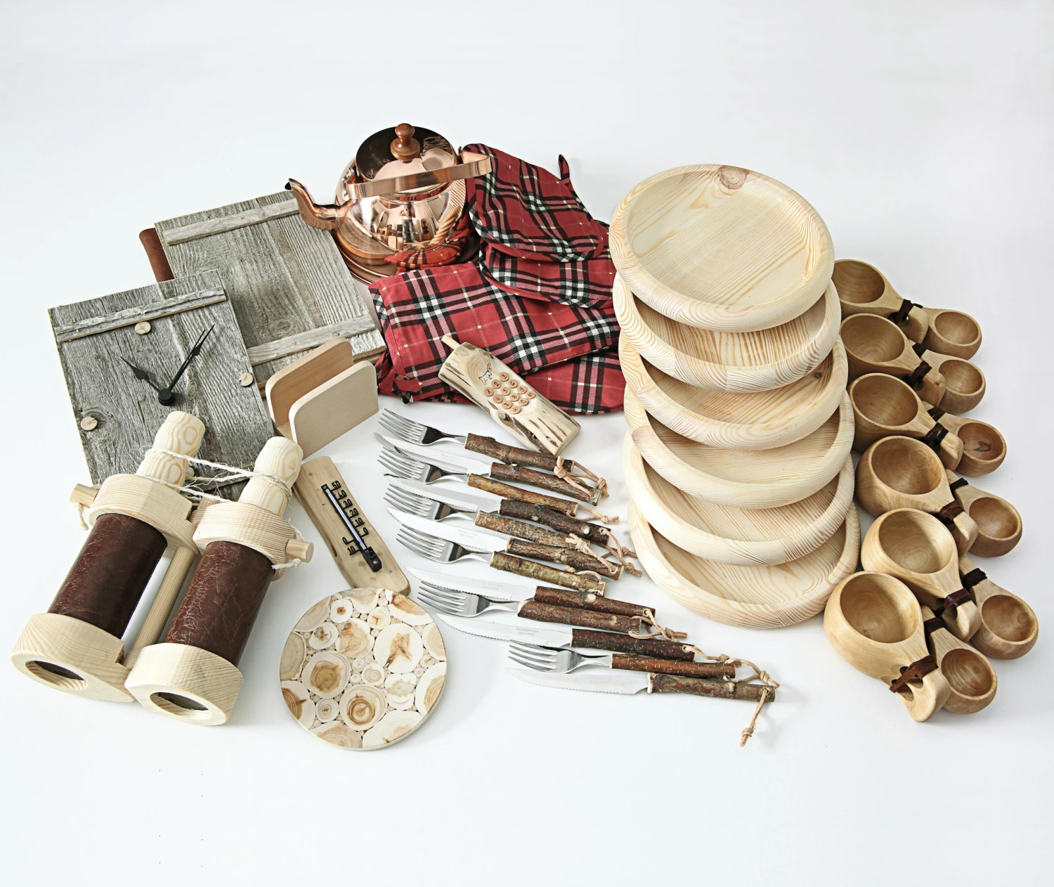 Wolff Finnhaus Lapplandpaket ohne Rentierfelle . Lapplandpaket bestehend aus: Essgarnitur für 6 Personen, 6 Teller, 6 große und kleine Holztassen, 6 Gabeln und Messer, 1 Gästebuch, 1 Fernglas-Schnapsbehälter, 1 Kupferkaffeekanne mit Untersatz, 1 Serviettenständer, 1 Paar Grillhandschuhe, 1 Paar Topflappen, 1 Uhr aus Kelo-Holz und Holzhandy (Flaschenöffner).